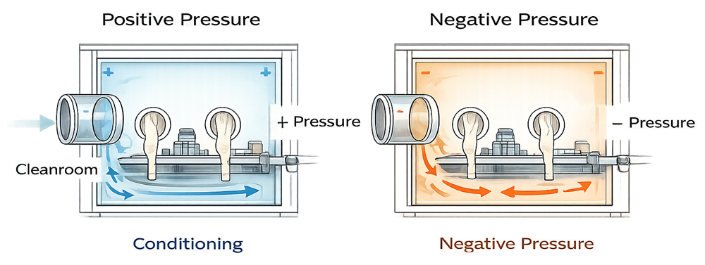 Pressure regime is a defining design parameter. In product-protection applications, isolators operate under positive pressure relative to the surrounding cleanroom so that any leakage path results in outward airflow, protecting sterile product from room ingress. In containment applications involving potent compounds or hazardous materials, isolators operate under negative pressure relative to the room, ensuring that any leakage results in inward airflow and containment of hazardous particulates or vapors within the enclosure.