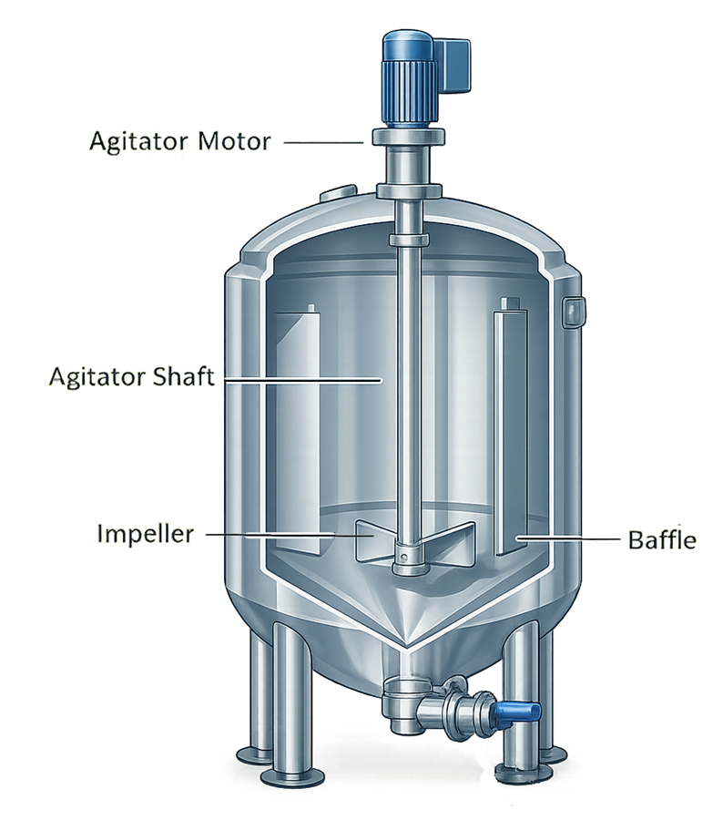 Drainability is a critical design parameter. Vessel bottoms are typically designed with a conical or sloped geometry that directs liquids toward the bottom outlet valve, allowing complete removal of product and cleaning solutions.